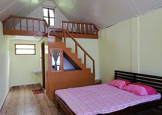 It is an duplex room where there is one double (6'5') at ground level and there is a stair case and in the above section there is a similar size mattress is kept. The upper level is good for kids. The upper level is not recommended for elderly people.
