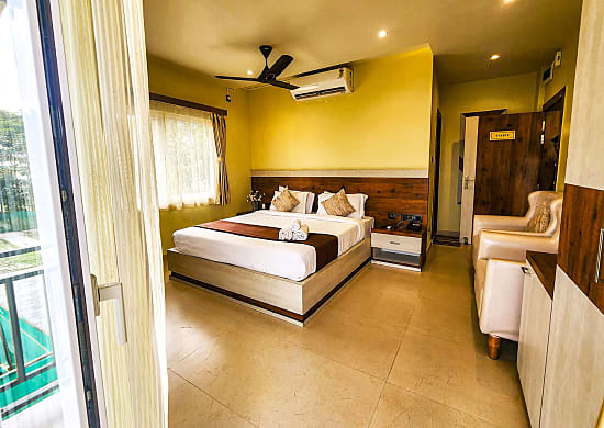 The resort offers three room types—Family Quad Room, Premium Cottage Double Room, and Executive Double Room. Family Quad Rooms are spacious with two queen-sized beds, AC, attached bathrooms, and large windows overlooking Murti’s greenery, perfect for family stays. Premium Cottages feature king-size beds, airy balconies, wooden closets, ergonomic chairs, and modern fittings, ideal for couples seeking royal comfort. Executive Rooms offer similar luxury with cozy, intimate layouts and scenic views. All rooms include a private coffee room with nature views, ensuring relaxation at its finest. With world-class hospitality and eco-conscious design, Oxytel Club & Resort stands as one of the finest resorts in Dooars.